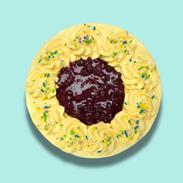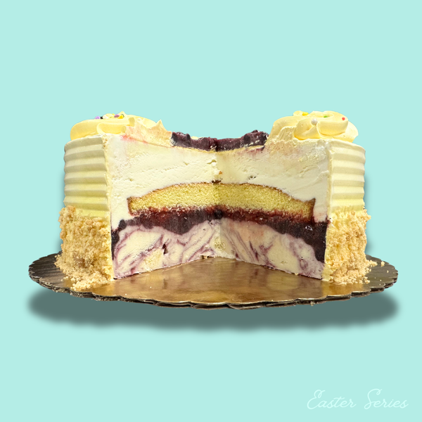 A refreshing Blackberry Lemon Bar ice cream forms the base, layered with tangy lemon streusel cake and a vibrant blueberry and raspberry filling, all crowned with smooth vanilla ice cream. Coated in a sweet lemon buttercream, it's adorned with crunchy shortbread cookie pieces and topped with a burst of blueberry and raspberry goodness.