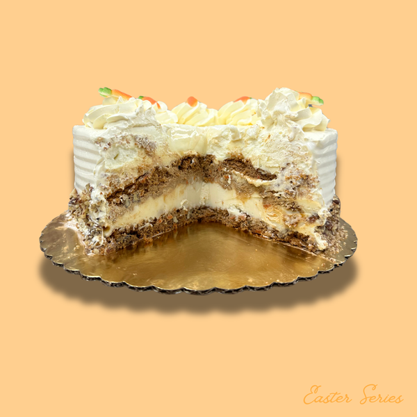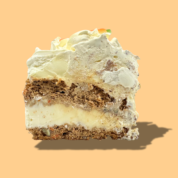 Indulge in a timeless flavor with rich vanilla ice cream nestled between smooth, sweet cream caramel and two generous layers of spicy carrot cake. Covered in a perfectly balanced cream cheese buttercream, not too sweet, it's drizzled with luscious caramel, crowned with crunchy pecans, and beautifully finished with delicate carrot decorations.