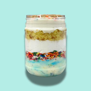 Bright blue Birthday Cake ice cream, vanilla buttercream, sprinkles, yellow cake, and vanilla ice cream. Iced in vanilla buttercream and coated with our signature colorful sprinkle mix topped with edible cookie dough chunks.