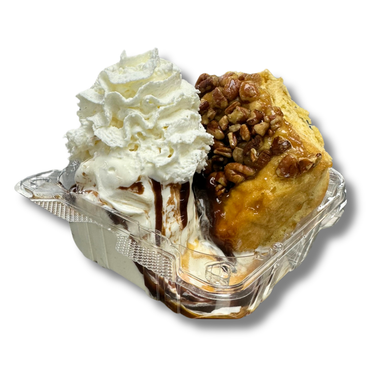 A warm and gooey pecan role paired with vanilla ice cream, sweet cream caramel, and milk fudge. .Topped with whipped cream.