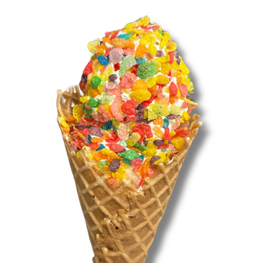 A large waffle cone swirled with your choice of vanilla, chocolate, or twist ice cream, brimming with your choice of favorite cereal.