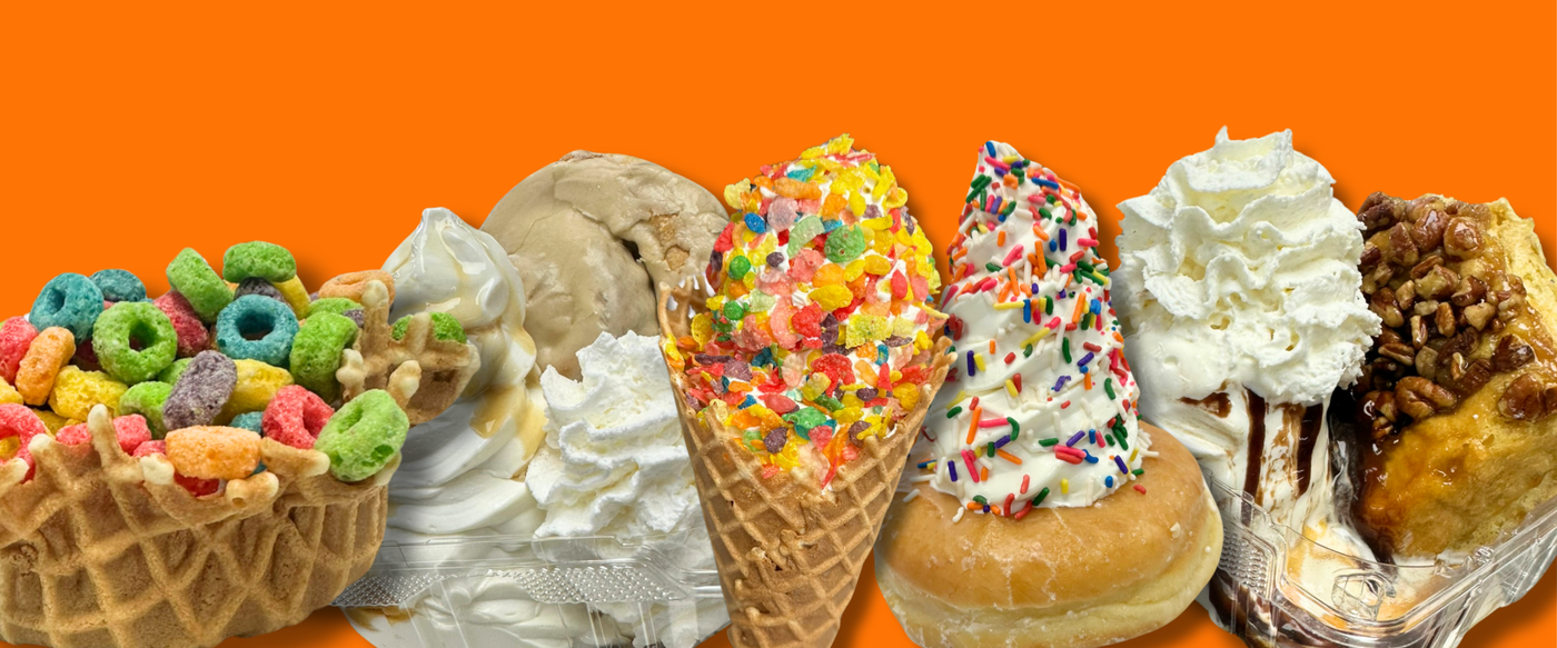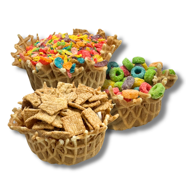 Indulge in our freshly made waffle bowl, filled with your choice of creamy vanilla, rich chocolate, or a delightful twist of both ice creams, and crowned with your favorite cereal for the ultimate cereal experience.