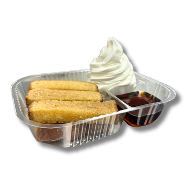 Warm french toast sticks paired with maple syrup and vanilla ice cream.