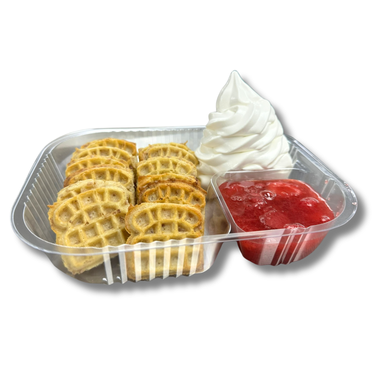 Cinnamon waffles, vanilla ice cream, and your choice of strawberry or blueberry topping.